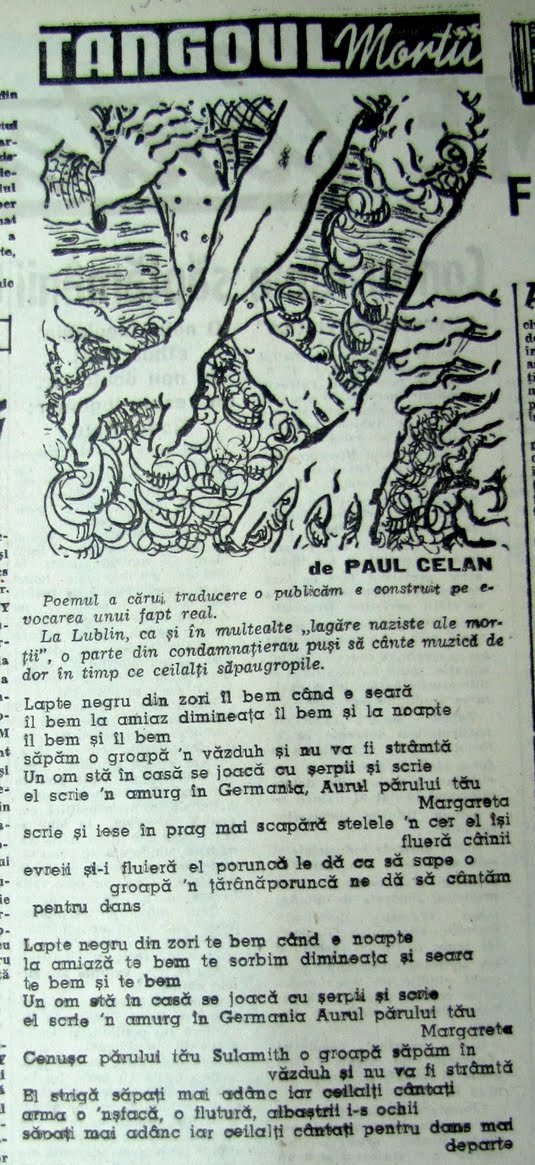 70 лет назад, 2 мая 1947 года в бухарестском еженедельнике Contemporanul был опубликован румынский перевод стихотворения никому не известного поэта Пауля Целана "Tangoul morţii" ("Танго смерти"). Стихотворение перевел с немецкого Петре Соломон, а автора никто и не мог знать - псевдоним был использован впервые для этой публикации. Перевод названия соответствовал, вероятно, одной из ранних версий оригинала. Под названием "Todesfuge" стихотворение было впервые напечатано по-немецки только год спустя и за следующие десятилетия стало одним из самых известных поэтических текстов в мире. Про него написаны многие сотни книг и статей, оно многие сотни раз переведено на другие языки, десятки раз положено на музыку. Музыка самого стиха прекрасно слышна в авторском чтении. Послушать его стоит независимо от знания немецкого языка: