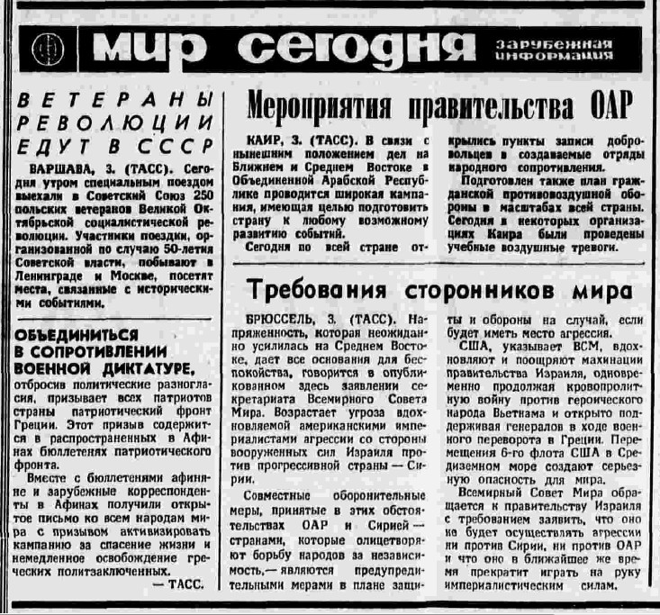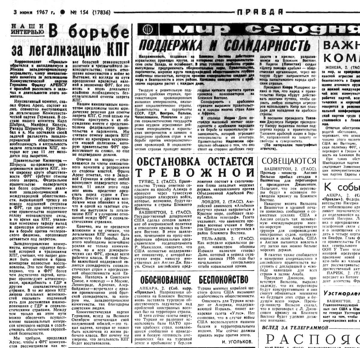 10 лет назад я подобрал вырезки из газеты "Известия" от начала июня 1967 года. Сегодня, для полноты картины, давайте почитаем "Правду". Собственным корреспондентом "Правды" в Каире был тогда относительно молодой советский ученый Евгений Максимович Примаков. Есть основания предполагать, что Евгений Максимович работал не только в "Правде", и, возможно, за событиями он не просто наблюдал, но и в меру сил участвовал. 3 июня он посылает в родную газету короткую заметку о конференции арабских стран в Багдаде, собирающейся предупредить израильских агрессоров и их империалистических покровителей о неприятностях, которые сулит им участие в агрессии. Интересно, что оптимизм текста довольно сдержанный, не иначе как собкор уже что-то понимал: