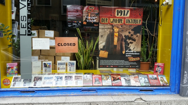 В городе-колыбели Великого Октября готовятся отметить его столетие. Ну, то есть, может и не все готовятся, но в витрине популярной видеотеки висит афиша показа нового полнометражного документального мультфильма Катрин Роте "2017: настоящий Октябрь":