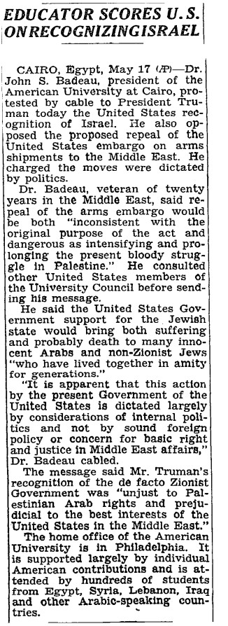 Грозит ли сегодняшняя декларация какими-то опасностями? Да. Можно ли было этих опасностей избежать? Конечно можно, всего-то нужно было не признавать Иерусалим столицей Израиля. Как, например, последние 20 лет, когда он не был признан и не случалось никаких взрывов в автобусах, наездов грузовиками, ракетных обстрелов. И вообще, арабы и евреи "lived together in amity for generations". Ой, это опять не сегодня. Последняя фраза, процитированная в НЙТ 18 мая 1948 года, принадлежит Джону Бадо, президенту Американского университета в Каире. Он послал президенту Трумэну телеграмму с гневным осуждением признания Израиля Соединенными Штатами. Там у него, кстати, были не просто "арабы и евреи", а "Arabs and non-Zionist Jews". С последними арабы и сегодня готовы жить дружно. Как только они освободят от себя Иерусалим и весь Израиль.