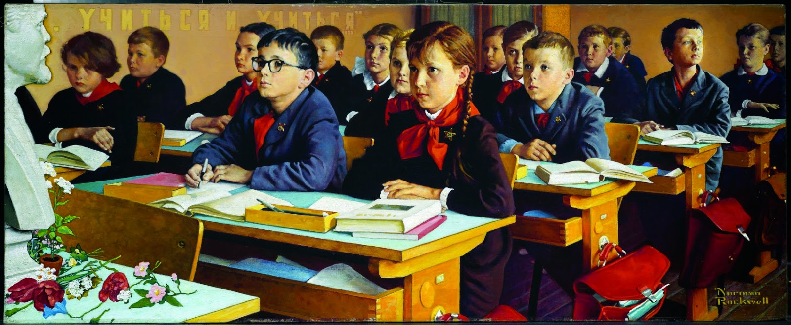 На этой картине вся мизансцена двухсторонне-постановочная, с одной стороны Роквеллом, с другой — его московскими кураторами. Говорят, что идея занести бюст Ленина из вестибюля и поставить его на учительский стол принадлежала Роквеллу. Он же, я думаю, перенес надпись про "учиться, учиться" из коридора в класс. Еще я не припоминаю ярко-красных портфелей в те времена. Значит тоже, либо украшательство, либо школа для детей сотрудников МИДа и/или Совморфлота.