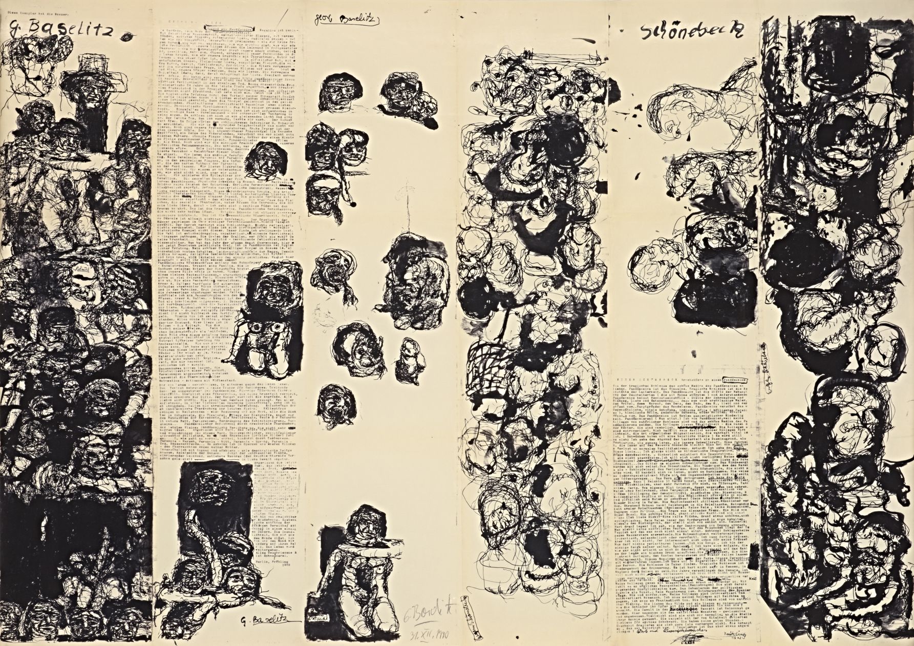 Ойген Шёнебек считается одной из ключевых фигур в послевоенном германском искусстве, несмотря на то, что он рисовал только десять лет (1957-1967) и не все его работы сохранились. В начале 60-х он вместе со своим другом Георгом Базелицем (ставшим еще более знаменитым художником ) организовали выставку в одном из разбомбленных в 1945 году зданий (таких зданий в тогдашнем Берлине было много). В других местах их выставлять не хотели, поскольку они не были абстракционистами, что в те времена не приветствовалось. По случаю выставки они подготовили иллюстрированный манифест ("Пандемонический манифест"), который интересно перекликается с "Реалистическим манифестом" братьев Певзнеров (Наум Габо и Нотон (позднее Антуан) Певзнер), написанном на 30 лет раньше. Шёнебек и Базелиц изучали раннее советское искусство и могли знать про "Реалистический манифест". Вот эти манифесты (кликабельно):